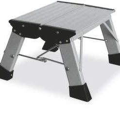 Fahrbare Stufen-Plattformleiter, Aufstieg einseitig, 7 Riffelblechstufe(n) (inkl. Podest), Standhöhe 1,65 m, Podest Breite x Tiefe 500 x 450 mm, Holmlänge 2,85 m, sichere Anwendung durch Handlauf, Quertraverse, Sicherheitsbügel und Spreizsicherung, Handlauf beidseitig, Quertraverse 0,88 m breit, 2 Rollen am Holmende, platzsparend zusammenklappbar, aus Aluminium, Gewicht 20 kg.