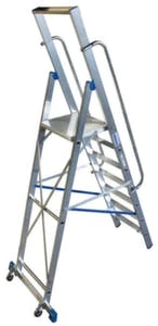 Fahrbare Stufen-Plattformleiter, Aufstieg einseitig, 9 Riffelblechstufe(n) (inkl. Podest), Standhöhe 2,1 m, Podest Breite x Tiefe 500 x 450 mm, Holmlänge 3,35 m, sichere Anwendung durch Handlauf, Quertraverse, Sicherheitsbügel und Spreizsicherung, Handlauf beidseitig, Quertraverse 0,97 m breit, 2 Rollen am Holmende, platzsparend zusammenklappbar, aus Aluminium, Gewicht 22 kg.