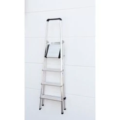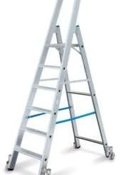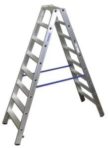 Klappleiter, Aufstieg beidseitig, 2 x 3 Riffelblechstufe(n) (inkl. Podest), Standhöhe 0,25 m, Holmlänge 0,8 m, Stufen-Holm-Verbindung gebördelt, erhöhte Stabilität durch Eckverstrebungen an der unteren Stufe, sichere Anwendung durch Spreizsicherung, rutschhemmende Fußstopfen (SafetyCap) am Holmende, aus Aluminium, Gewicht 4,2 kg.