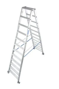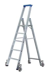 Rollbare Stufenleiter, Aufstieg einseitig, 5 Stufen (inkl. Podest), Standhöhe 1,2 m, Podest Breite x Tiefe 300 x 250 mm, Stufentiefe 80 mm, Holmlänge 1,95 m, Stufen-Holm-Verbindung gebördelt, erhöhte Stabilität durch Eckverstrebungen an der unteren Stufe, sichere Anwendung durch Sicherheitsbügel und Spreizsicherung, mit praktischer Ablageschale und Eimerhaken, rutschhemmende Fußstopfen (SaftyCap) und 4 Federrollen am Holmende, aus Aluminium, aufgestellt Höhe 1800 mm, Gewicht 9,7 kg, Sicherheitshinweis: bei fahrbaren Stehleitern sind gemäß DGUV Information 208-016 bei der Benutzung stets die Zug- und Drucksicherungen zu verwenden!, Qualitätssicherung gemäß DIN EN 131, entspr. DGUV 208-016 (ehem. BGI 694).