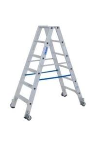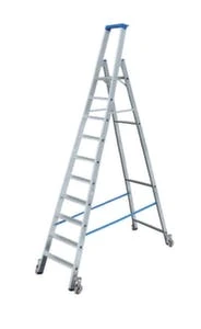 Rollbare Stufenleiter, Aufstieg einseitig, 10 Stufen (inkl. Podest), Standhöhe 2,35 m, Podest Breite x Tiefe 300 x 250 mm, Stufentiefe 80 mm, Holmlänge 3,2 m, Stufen-Holm-Verbindung gebördelt, erhöhte Stabilität durch Eckverstrebungen an der unteren Stufe, sichere Anwendung durch Sicherheitsbügel und Spreizsicherung, mit praktischer Ablageschale und Eimerhaken, rutschhemmende Fußstopfen (SaftyCap) und 4 Federrollen am Holmende, aus Aluminium, aufgestellt Höhe 3000 mm, Gewicht 15,3 kg, Sicherheitshinweis: bei fahrbaren Stehleitern sind gemäß DGUV Information 208-016 bei der Benutzung stets die Zug- und Drucksicherungen zu verwenden!, Qualitätssicherung gemäß DIN EN 131, entspr. DGUV 208-016 (ehem. BGI 694).