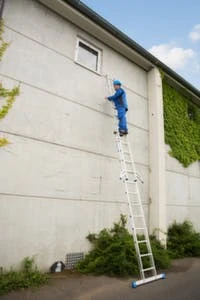 Schiebeleiter, 2 x 12 rutschsicher profilierte Sprossen, für eine Arbeitshöhe bis ca. 6,85 m, Holmlänge 3,55 – 6,05 m, Sprossen-Holm-Verbindung gebördelt, zweiteilig, von Sprosse zu Sprosse verstellbar, sichere Anwendung durch automatisch einrastender Fallhaken, aus Aluminium, Gewicht 14,9 kg, gemäß DIN EN 131.