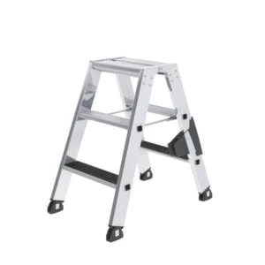 Stehleiter, Podest Höhe 650 mm, 2 x 3 Riffelblechstufe(n) (inkl. Podest), Stufentiefe 125 mm, sichere Anwendung durch Multifunktionsklappsperre als Spreizsicherung, rutschhemmende Fußkappen am Holmende, aus Aluminium, Gewicht 4,7 kg, gemäß EN 14183.