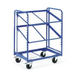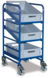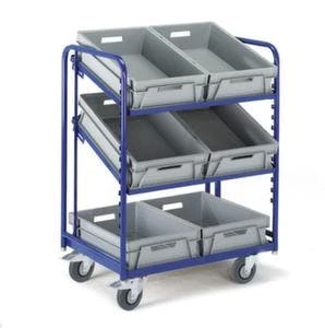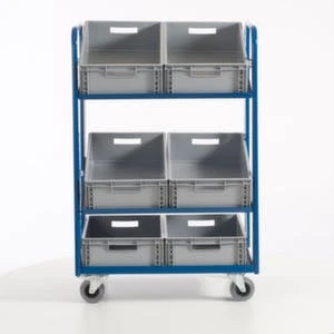 Etagenwagen, Traglast 200 kg, mit 3 Etage(n), Ladefläche Länge x Breite 410 x 610 mm, Böden offen mit Rahmen, mit 3 Kästen, für Euronorm-Behälter, Gestell mit Pulverbeschichtung in RAL5010 Enzianblau, geschweißte Stahlkonstruktion, Höhe x Länge x Breite 1350 x 620 x 470 mm, 4 Lenkrollen, Rad Ø 125 mm, mit thermoplastisch-Bereifung, Naben mit Rillenkugellager, 2 Lenkrollen mit Feststellern, Radanordnung rechteckig.