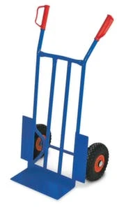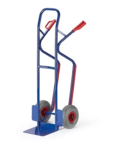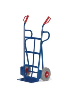 Sackkarre, Traglast 250 kg, Schaufel Breite x Tiefe 400 x 180 mm, geschweißte Stahlkonstruktion, Gestell mit Pulverbeschichtung in RAL5010 Enzianblau, Höhe x Breite 1200 x 630 mm, Sicherheitsgriffe aus hochfestem Kunststoff, mit TPE-Bereifung auf Kunststoff-Felge, Rad Ø 250 mm, Naben mit Rollenlager.
