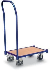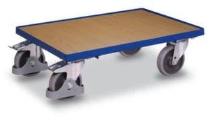 Plattformwagen, Traglast 250 kg, Ladefläche Länge x Breite 605 x 410 mm, Plattform aus Holz, Gestell in RAL5010 Enzianblau, 4 Lenkrollen, mit Gummi-Bereifung, 2 Lenkrollen mit Feststellern, 12 Jahre Garantie.